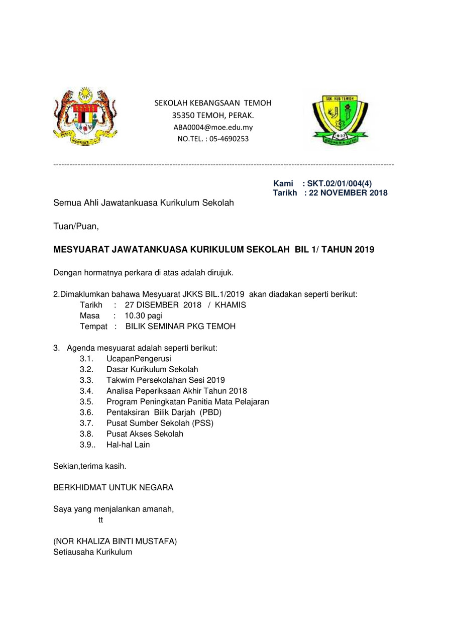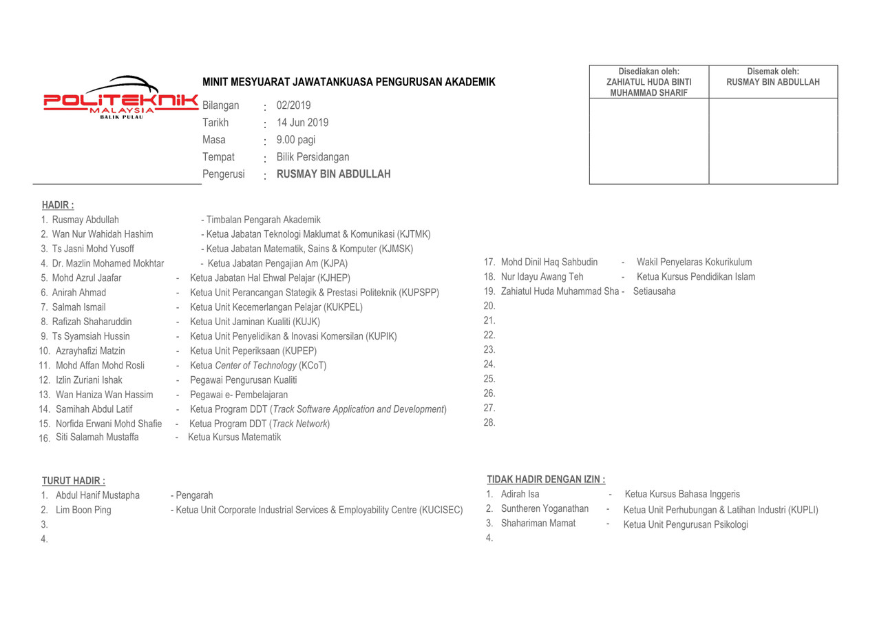 Format minit mesyuarat yang umum sebelum kita ingin membina atau melengkapkan minit mesyuarat, amatlah baik jika korang sudah mempunyai format minit mesyuarat yang kosong ataupun 'blank format'. Minit mesyuarat kursus kepimpinan dan kemahiran interpersonal ukm bangi,kumpulan rose 2019/2020. Minit mesyuarat adalah laporan mengenai perkara yang dibincangkan atau diputuskan dalam sesuatu mesyuarat. Mesyuarat merupakan satu prosedur pentadbiran yang wajib dilakukan oleh setiap pengurusan sekolah. 5 penulisan minit mesyuarat tanggungjawab menulis minit mesyuarat begitu penting dilakukan kerana merupakan satu dokumentasi, dan akan dijadikan sumber rujukan pada masa hadapan. Minit mesyuarat adalah satu laporan mengenai perkara yang dibincangkan atau diputuskan dalam sesuatu mesyuarat. Drk 3132 mesyuarat minit ( kempen zero polisterin ). Minit mesyuarat mbpjpengedaran minit mesyuarat adalah tertakluk kepada kebenaran oleh pihak pengurusan mbpj. Semak format penulisan yang terbaik untuk memastikan perjalan pengurusan sekolah berjalan dengan. Format baharu minit mesyuarat format personalized items. Antara perkara yang perlu ada dalam minit mesyuarat adalah tajuk minit mesyuarat, bil/tahun, tarikh, masa, tempat. Penyediaan minit mesyuarat hendaklah dilaksanakan melalui sistem mymesyuarat. Selain itu, bermula tahun 2018, pengurusan dan pentadbiran sekolah pada tahun 2017 akan dinilai berdasarkan skpmg2.
